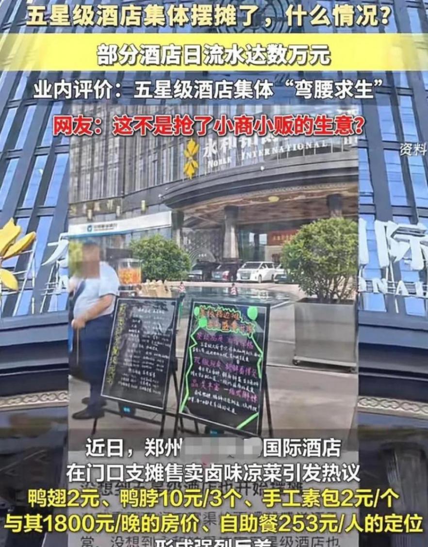 最近看到报道说很多五星级酒店开始摆地摊了。西安郑州这些地方的五星酒店每天下午都支起摊子卖卤菜和面点,经理自己站那儿吆喝,一份凉拌菜二十块,鸭脖三个才十块,价格跟路边摊差不多。有家店第一天就卖了六万多,相当于餐厅一天的流水。这消息一出,网上讨论可热闹了。