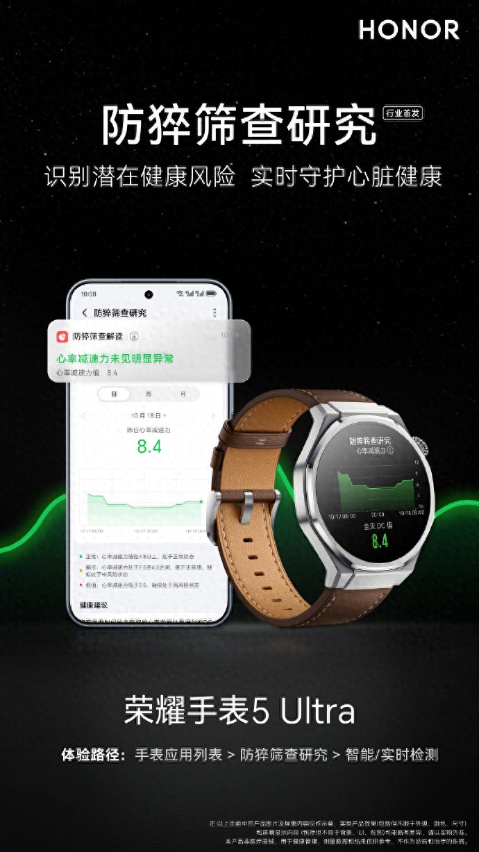距离发布会还有不到一周时间,荣耀官方已经陆续开启这款健康穿戴新品的预热,从刚刚发布的预热海报来看,这次荣耀手表 5 Ultra 确认首发“防猝筛查研究”,将行业率先实现心率减速力监测落地。