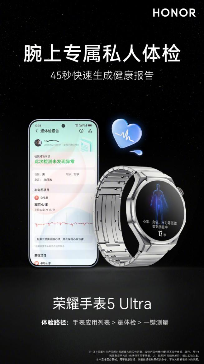 可以说,荣耀用 AI 技术重构了智能手表的健康体验,让每一个用户都能拥有“腕上 AI 管家”。无论是日常的健康管理,还是对冠心病、心衰患者的日常风险防护,荣耀手表 5 Ultra 都能提供有力的支持,为预防心脏突发事件筑牢防线。
