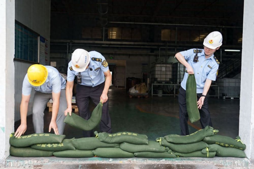 金山区应急管理局执法大队执法人员走进企业在车间设置防水板和沙袋。上海金山消防 图