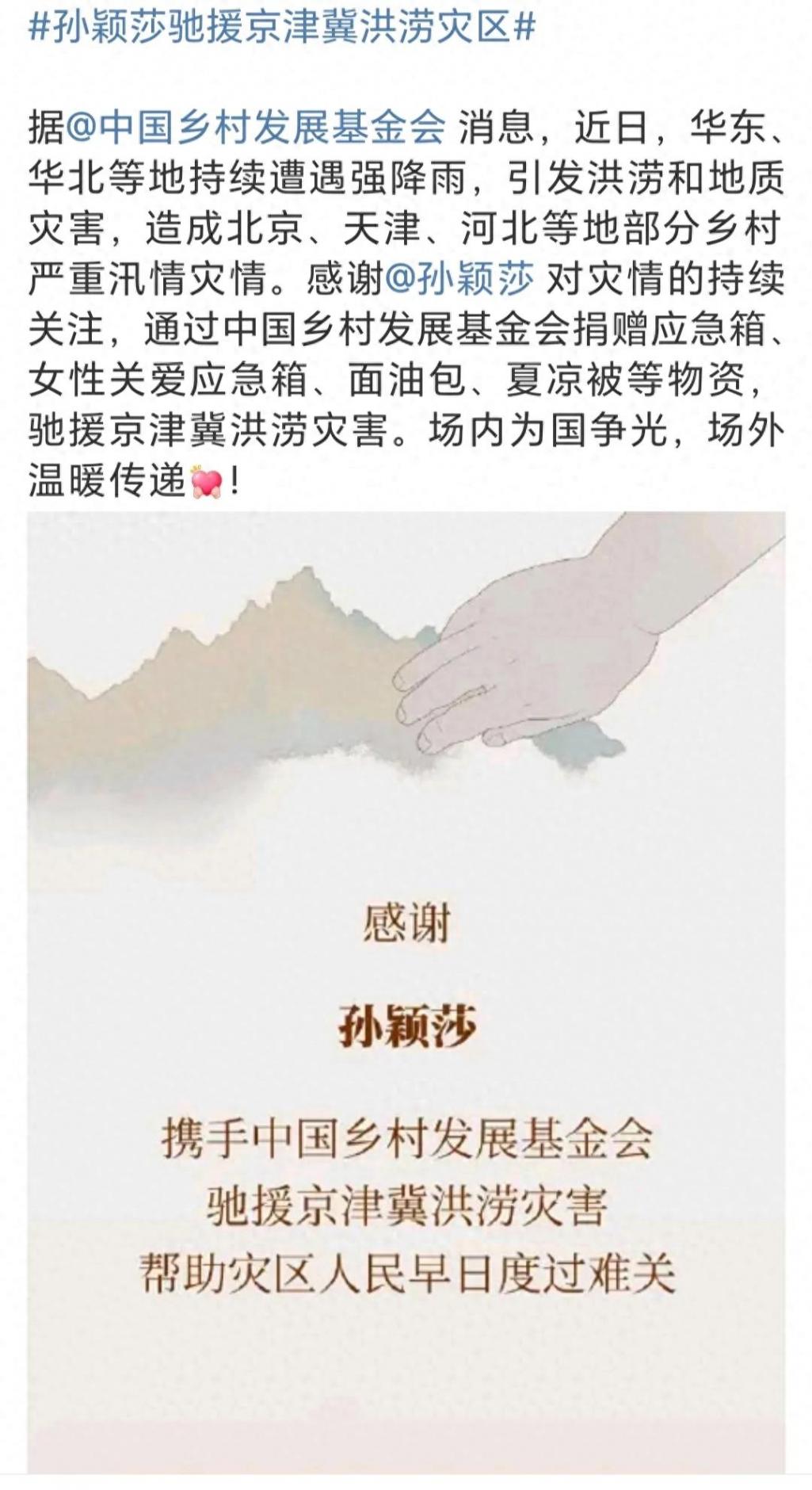 北京时间7月29日,乒乓球运动员孙颖莎通过中国乡村发展基金会向受灾地区捐款捐物,紧急驰援。