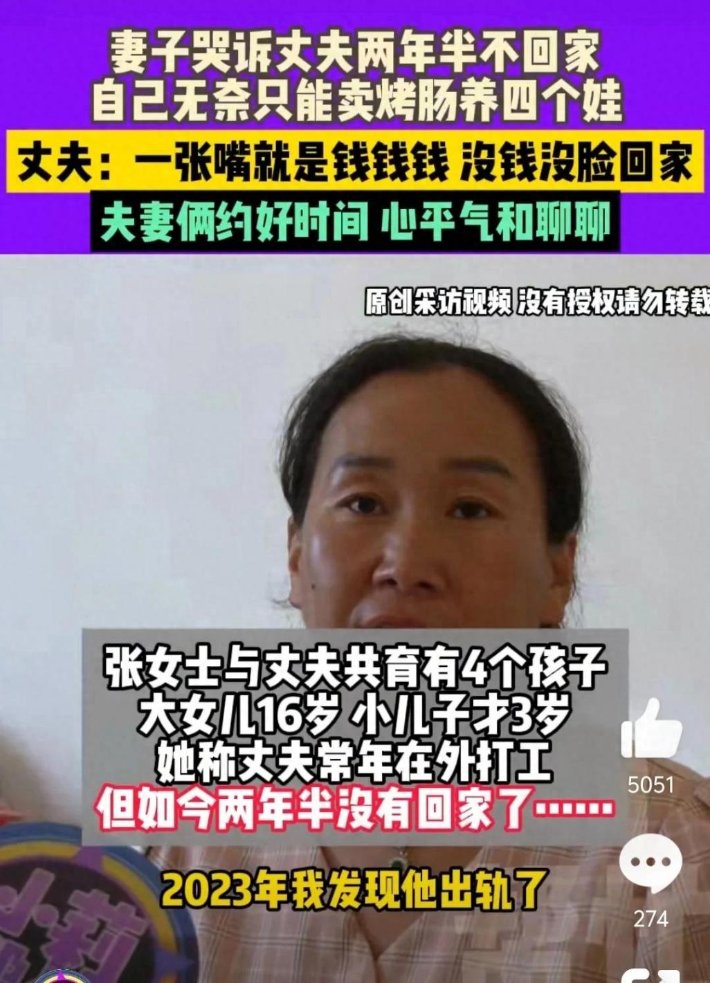 在河南周口的这个家庭中,张女士与丈夫结婚已经长达17年,育有三个女儿和一个儿子。在过去的两年里,由于夫妻间频繁的争吵和怀疑丈夫出轨,导致丈夫长时间不回家。张女士作为家庭支柱,不得不一人肩负起抚养四个孩子的重任。