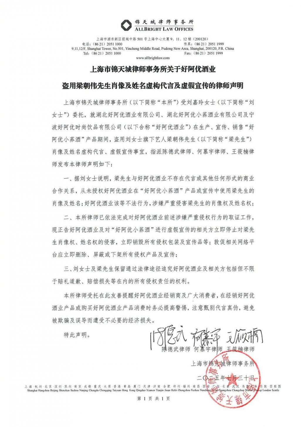 7月31日,刘嘉玲通过微博发布律师声明,直指内地某酒企在未经授权情况下,擅自使用其丈夫梁朝伟的姓名及影视形象进行产品包装与广告传播,引发公众对明星商业授权透明度的强烈关注。