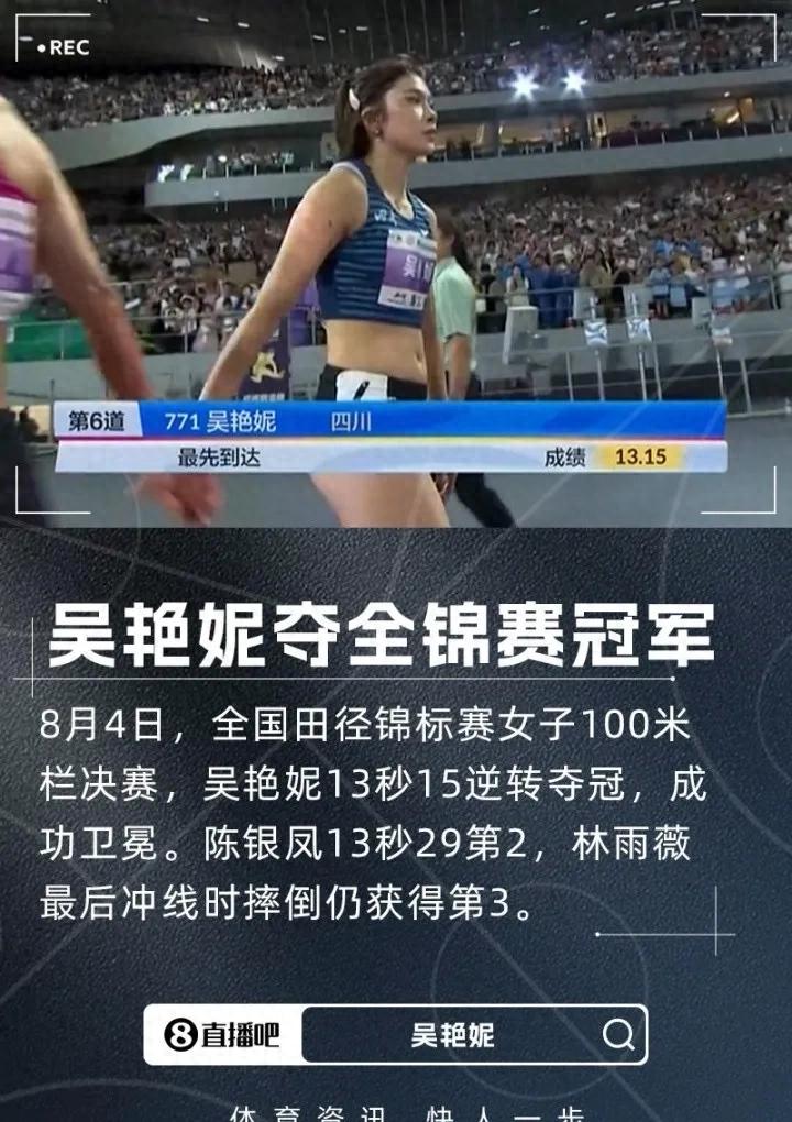 全国田径锦标赛女子100米栏决赛8月4日下午在成都举行。吴艳妮最终跑出13秒15夺冠,成功卫冕上届冠军头衔。陈银凤以13秒29拿到银牌,林雨薇冲刺时摔倒,比第三名有效成绩慢0.001秒险胜。