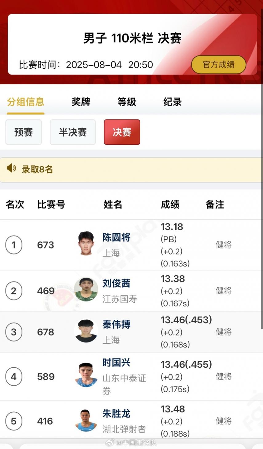 本赛季陈圆将更多出现在成年组的高栏比赛中。团队这么做的考虑,是通过高强度的比赛,以赛代练,帮助陈圆将在生理和心理上成长成熟,为未来踏上世界大赛舞台做好铺垫。陈圆将也非常争气,在全国大奖赛分站赛多次刷新PB,蚌埠站的成绩,已非常接近东京世锦赛13.27秒的达标线。