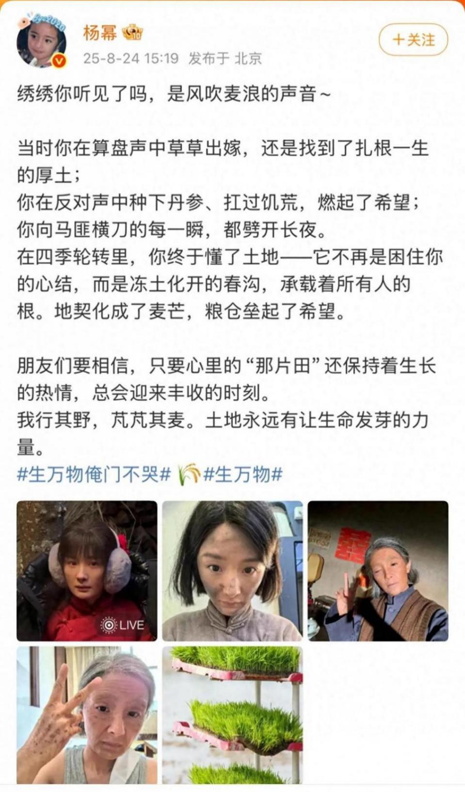 杨幂在告别文中,以宁绣绣的视角,回顾了角色在土地上的一生:从算盘声中草草出嫁,到在反对声中种下丹参、扛过饥荒,再到向马匪横刀的勇敢瞬间,最终领悟土地承载所有人根脉的意义。“绣绣你听见了吗,是风吹麦浪的声音”,字里行间满是对角色的不舍与深情 。