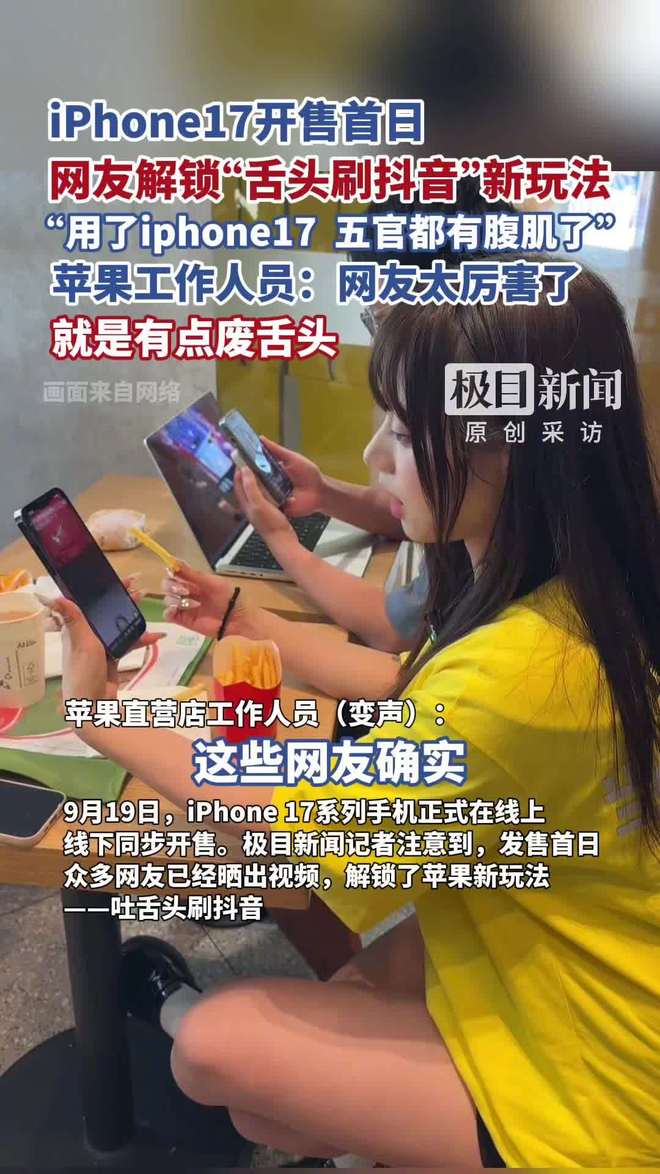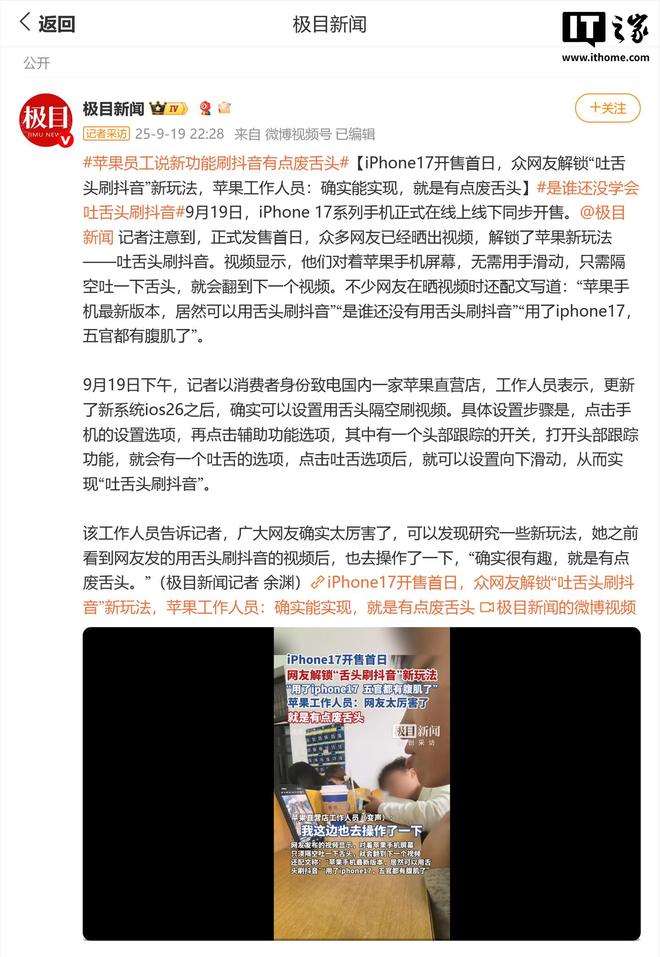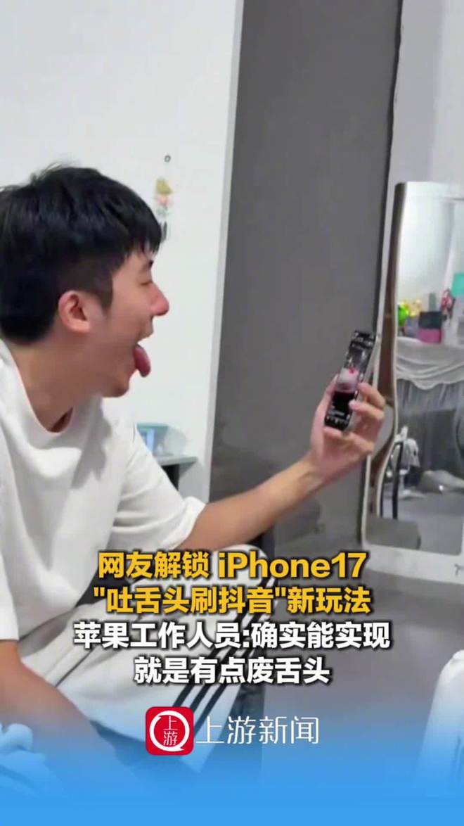 9 月 20 日消息,@极目新闻 昨日(9 月 19 日)发布微博,报道称在苹果 iPhone 17 系列开售首日,众多网友已经晒出视频,解锁了苹果新玩法 —— 吐舌头刷抖音。视频显示,他们对着苹果手机屏幕,无需用手滑动,只需隔空吐一下舌头,就会翻到下一个视频。