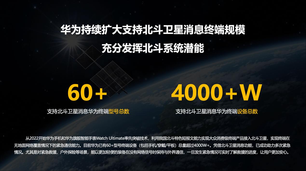 IT之家注意到,目前,支持北斗卫星消息的华为终端设备(包括手机、平板、穿戴设备)已超过 60 款,累计终端设备总数已突破 4000 万。