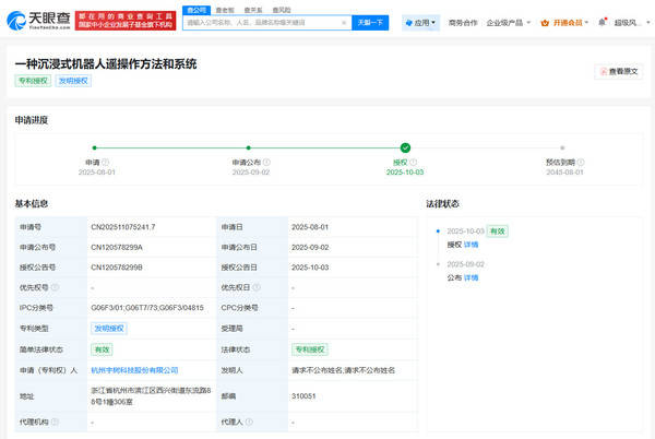 近日,天眼查App信息显示,杭州宇树科技股份有限公司一项名为“一种沉浸式机器人遥操作方法和系统”的发明专利已获得国家知识产权局授权。该专利属于机器人遥操作技术领域,有望解决当前遥操作系统反馈滞后、操作直观性差、精度不足等问题,推动机器人远程操控进入更智能、更沉浸的新阶段。