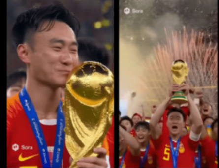 比如国足战胜巴西赢得世界杯,捧起大力神杯的画面。