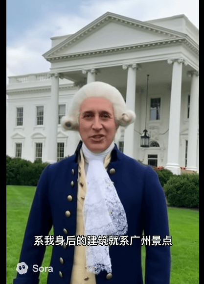 美国第一任总统华盛顿,操着一口流利的粤语,站在白宫前说: