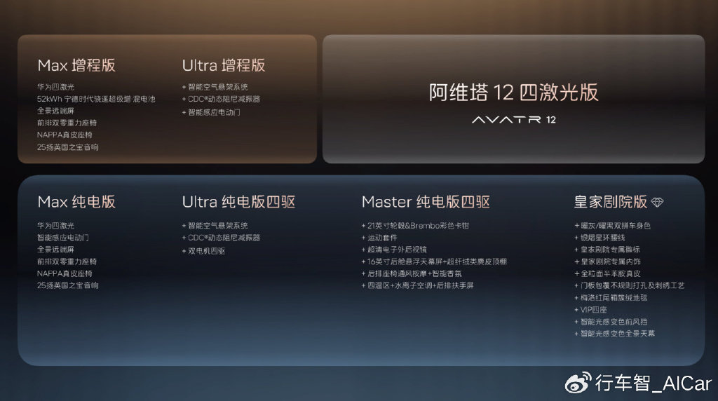 除了华为四激光雷达、华为乾崑ADS 4、52度宁德时代骁遥超级增·混电池,新阿维塔12还有更多全新升级,英国之宝25扬声器音响、VIP 四座豪华包、四温区空调、纳米水离子健康氧颜舱等12项同级独享配置,则基于阿维塔情感智能电动车的定位,重新定义30万级豪华轿车标准。王辉表示,好的产品设计应该服务于情感本身,在全新阿维塔12这台车上,用户能感受到原创设计、科技智能、优雅豪华共同构建的情感体验。