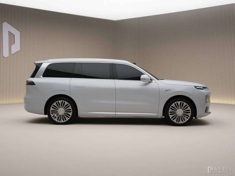 车身侧面设计简洁,搭配隐藏式车门把手.新车前后侧翼子板微宽出车体,前翼子板上镶嵌有摄像头硬件,轮拱内则搭配 21 英寸向往之境轮毂及米其林高性能静音轮胎。车身提供松谷绿、液态银、金属黑、天幕灰、光电白五种颜色选择