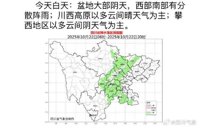 据四川气象,22日至25日,盆地阴天间多云多阵雨或小雨,局部中雨;川西高原和攀西地区,22日以多云间晴天气为主,23—24日大部阴天间多云有阵雨(雪),局部中雨,高海拔地区有中到大雪,需防范雨雪天气对交通运输等带来的不利影响。