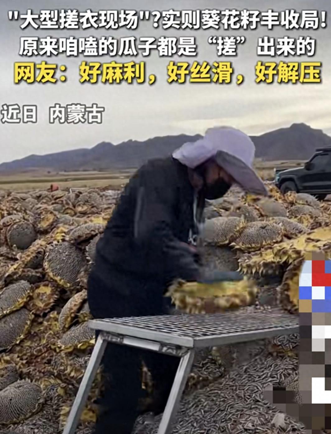 近日,一段葵花籽采收视频在网络意外走红。画面里,成熟饱满的向日葵花盘经晾晒后,工人们围坐一圈,通过搓揉或敲打的方式为其脱粒,金黄的瓜子簌簌落下,被网友形象地调侃为“大型搓衣现场”。这种充满烟火气的工艺,在内蒙古等葵花籽主产区十分常见,干燥后的花盘只需简单物理撞击,就能实现瓜子与花盘的高效分离,尽显劳动智慧。