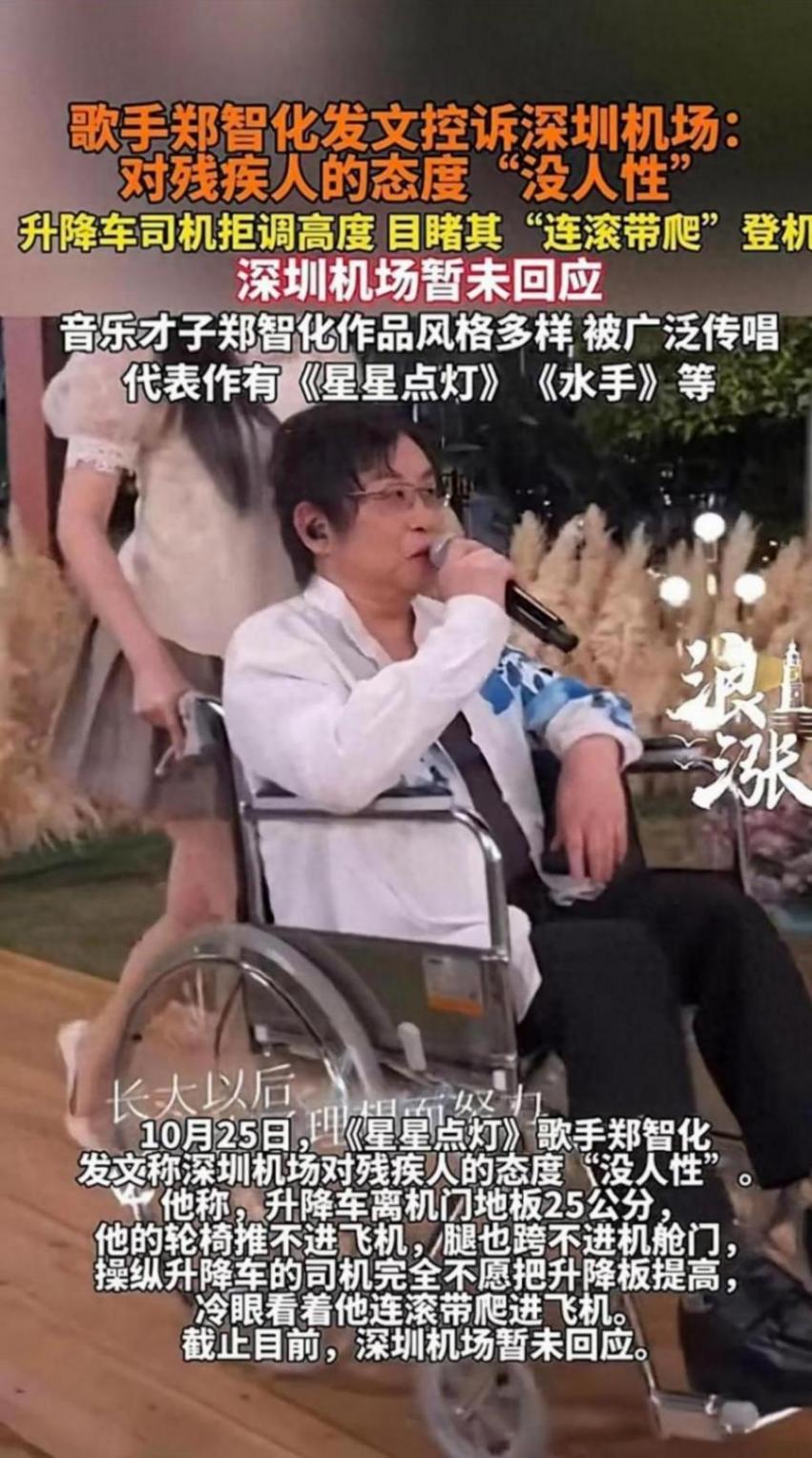 近日,歌手郑智化在深圳机场的一段经历引发了广泛关注。他在微博中控诉称,因机场升降车与机门地板存在25公分的高度差,导致轮椅无法顺利进入飞机舱门。更令人心寒的是,操作升降车的工作人员不仅没有采取任何补救措施,反而冷漠旁观,最终只能让郑智化“连滚带爬”进入飞机。