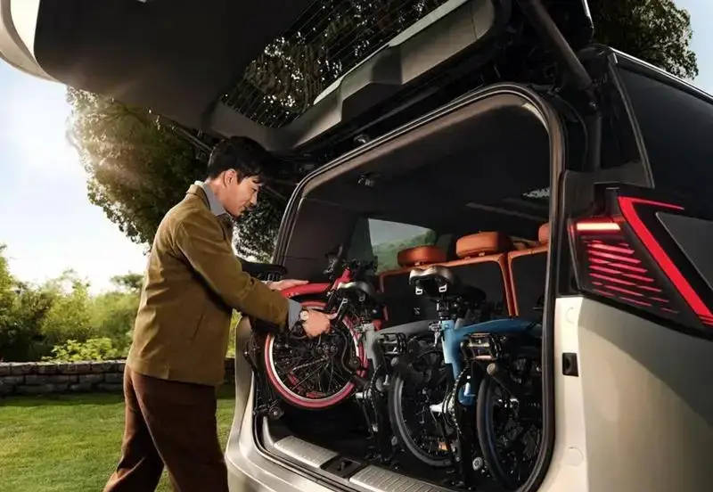 该车后备箱最大扩展容积可达1752L。即便三排满员,后备箱仍能容纳7只20寸行李箱加7个双肩包,或4套高尔夫大球包、4套专业钓具。在保障第二排舒适坐姿的前提下,放倒第三排座椅后,可收纳3辆26寸自行车,或2辆26寸自行车与2辆折叠车的组合。