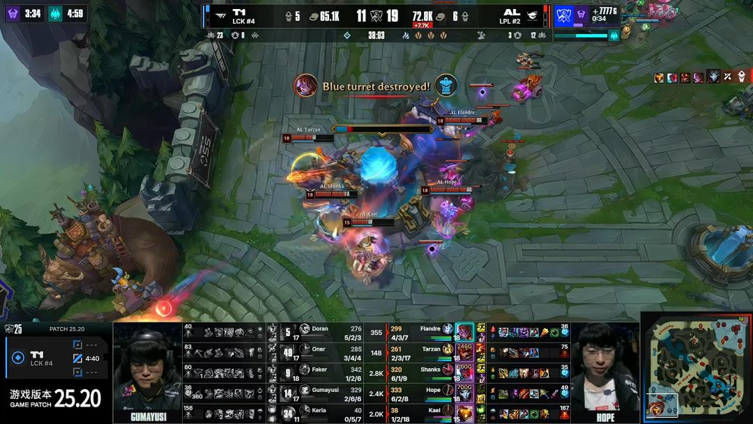 最后的决胜局,AL主帅Tabe押宝HOPE的个人能力,让选择了金克斯、璐璐、猪妹的保护发育组合,但T1拿出了梅尔、萨勒芬妮、艾希这三个擅长远程攻击的英雄进行应对。没有了KAEL的开团,AL战队遭到了T1的远距离消耗,AL对线阶段全面劣势,T1拿到了小龙、巢虫等中立资源。
