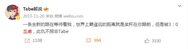 2013年,Tabe作为选手输给SKT(T1前身)立下报仇誓言。Tabe微博截图
