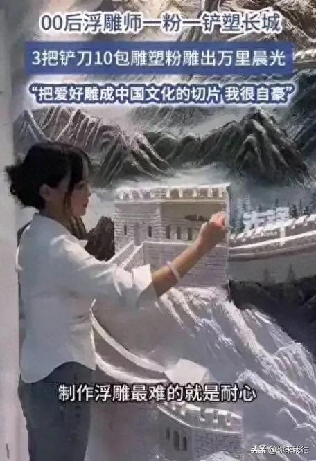 近日,河北保定一位00后女生戴紫怡凭借一则“7天在墙上雕出万里长城”的视频冲上百度热搜榜,引发全网热议。视频中,她手持3把工具铲、10包雕塑粉,在高2.4米、宽3.6米的墙面上,以浮雕技法复刻出蜿蜒的长城轮廓,山峦层叠、烽火台巍峨,连砖石纹理都清晰可见。网友纷纷感叹:“不上色的素坯反而更显高级,这才是传统技艺的纯粹之美!”
