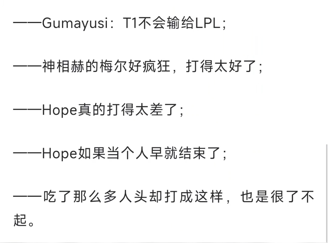 对于Hope在本轮系列赛的发挥表现,甚至引起了部分韩国网友和业内人士的一致嘲讽和吐槽!前T1辅助选手Wolf,在复盘比赛时坦言,Hope确实打的有点菜,然而T1并不是由于对手太菜才赢的,只是因为打得更好。与此同时,很多韩国网友更是发言嘲讽Hope,直言但凡Hope还能当个人,AL都赢下比赛了,同时不禁提出质疑,2-0开局的金克斯,究竟是如何输掉比赛的?对此有网友表示,就连作为LPL对手的韩国粉丝都看不下去了,纷纷对其进行“公开处刑”,Hope明年如果再不离开AL的话,真的说不过去了。