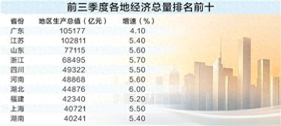 从经济总量看,广东前三季度GDP达到10.52万亿元,江苏为10.28万亿元,两省首次在三季度便站上10万亿元台阶。山东和浙江分别以7.71万亿元和6.85万亿元的体量、5.6%和5.7%的同比增速,展现出强劲的发展势头。