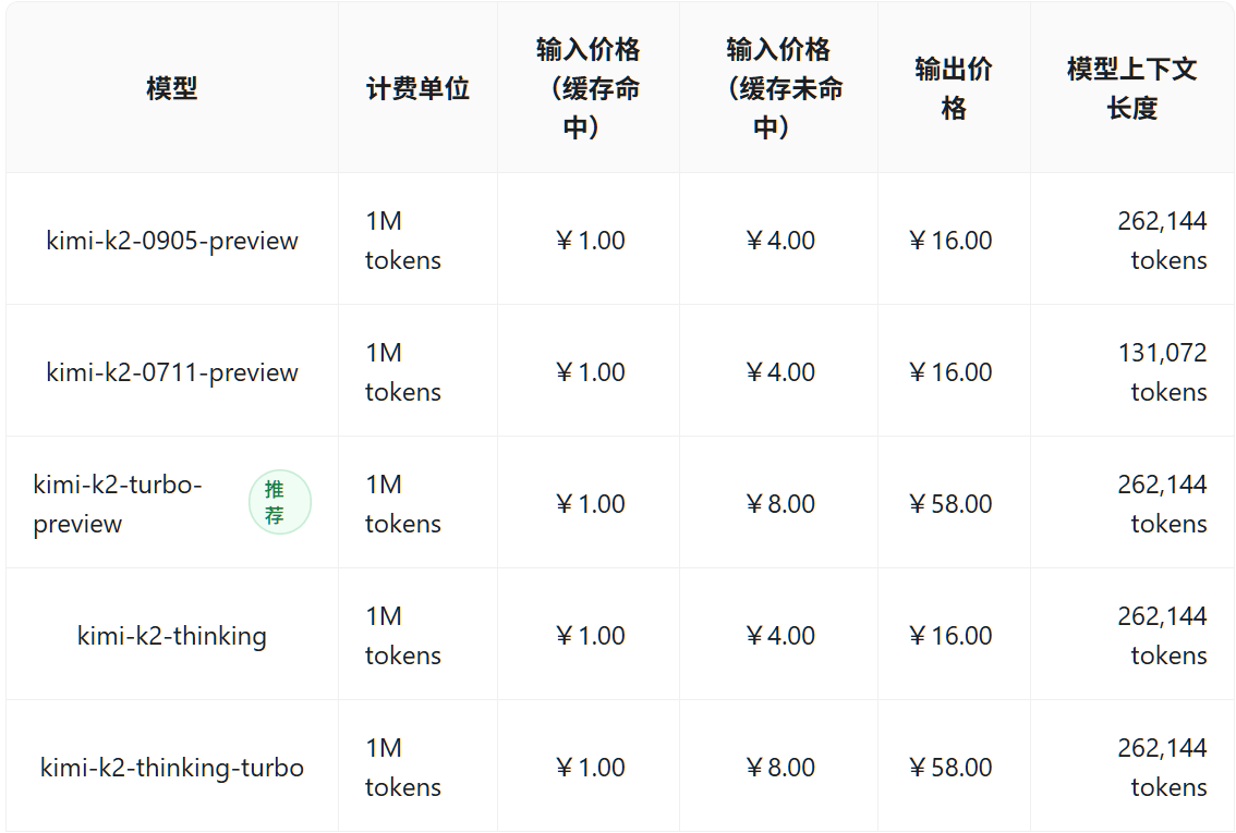 价格方面,kimi-k2-thinking每百万tokens的输入价格(缓存未命中)为4元、输出价格为16元;“高速版”kimi-k2-thinking-turbo每百万tokens的输入价格(缓存未命中)为8元、输出价格为58元,适用于需要深度推理和追求极致高速的场景。