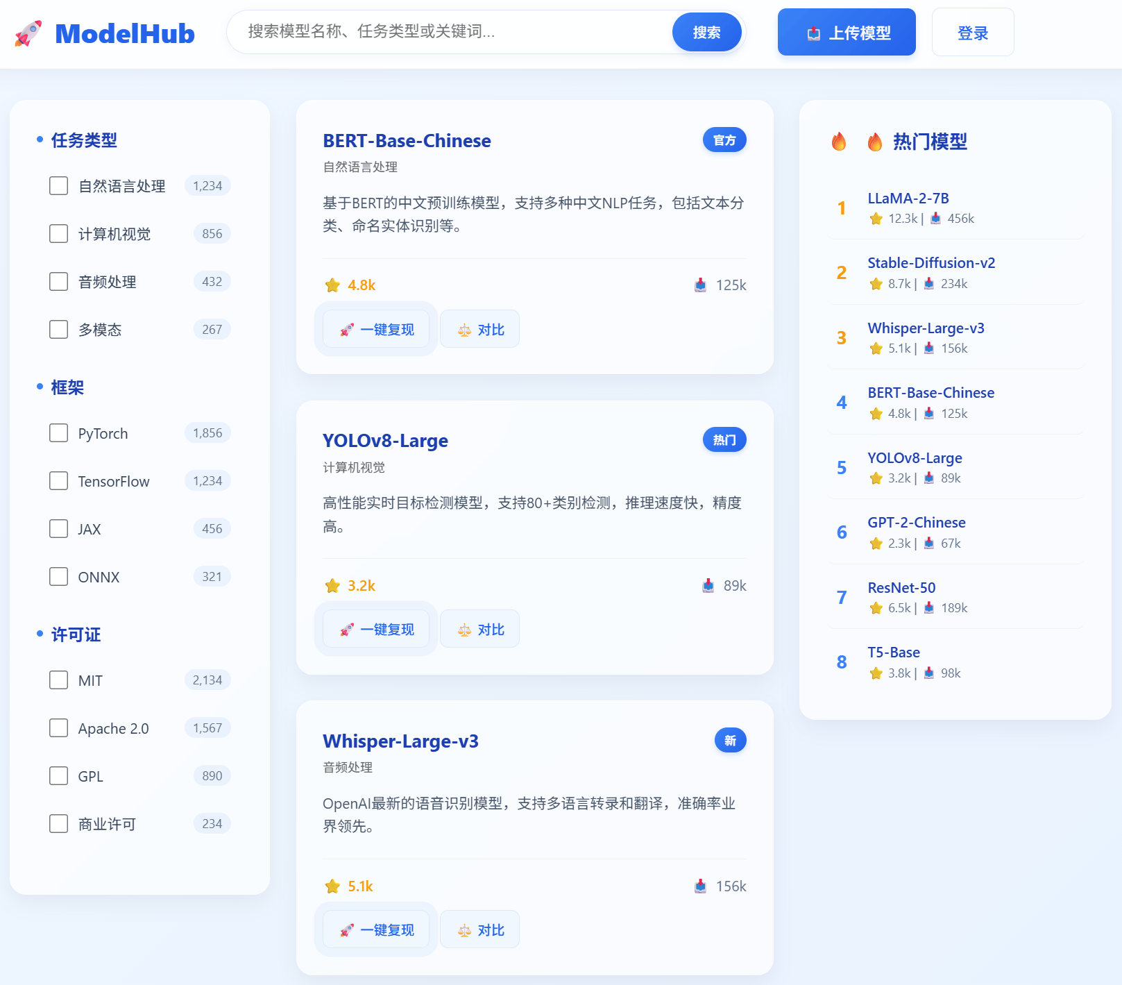从生成结果来看,我们对网页主要部分提出的要求都可以很好地被执行,包括导航栏有哪些部分、主题展示区由哪些模块组成,简洁现代的设计风格也有较好体现,一键复现、模型对比这两个特色功能也做了出来。