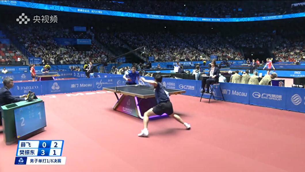 全运会男单1/8决赛上,上海队的樊振东vs湖北队的薛飞,樊振东越战越勇,11-5连胜三局,最终以4-1战胜薛飞,晋级8强。