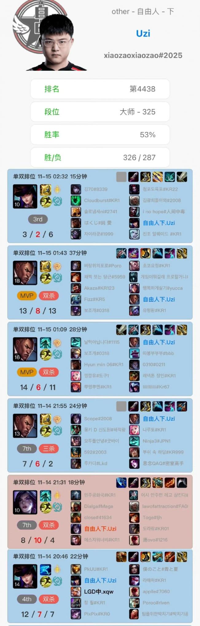 不过对于Uzi再次复出的事情,包括Uzi圈内好友在内,都觉得不可思议,毕竟Uzi如今已是事业美满、妻儿双全,肯定需要更多时间照顾和陪伴家人,况且前两次复出的发挥表现并不理想。然而最近有网友发现,Uzi突然恢复了高强度训练,短短一天时间内,就在韩服打了整整十五局排位,训练量甚至超过了职业选手,并且使用英雄都是当前版本最为OP的存在,例如女警、芸阿娜、卢锡安等等,因此有人怀疑,Uzi或许在为复出做准备,毕竟上一次加盟EDG的时候,就曾进行过如此高强度的训练。