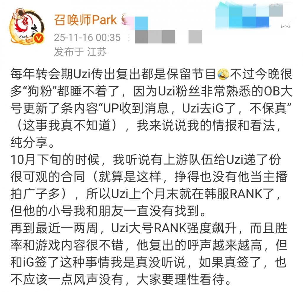 得知这个消息后,Uzi粉丝们无不感到欢欣雀跃,不过在兴奋之余,同样感到有些不可思议,于是便询问LPL知名爆料人“召唤师Park”事情是否属实,“召唤师Park”则表示Uzi是否会复出加盟IG,自己并没有确切消息,只不过前段时间有一支LPL顶级战队接触过Uzi,并且愿意许诺Uzi的首发位置,只是没有透露具体是哪支战队。