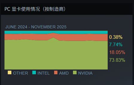 在显卡方面,NVIDIA仍以73.83%的使用率稳居第一,AMD和Intel分别以18.05%和7.74%位居二、三位,其中AMD的使用率呈持续上升趋势。