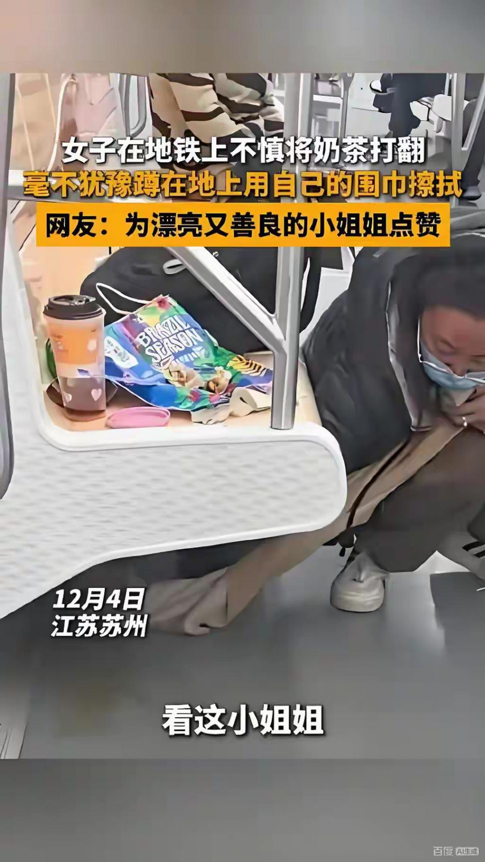 事情发生在12月4日的苏州地铁11号线上。一位年轻的女乘客在乘车时,一个不小心,手里的奶茶“啪”地一下打翻在地。哎呀,估计当时车厢里不少人都看了过来,场面一度有点小尴尬。但接下来这位小姐姐的举动,让所有人从惊讶变成了由衷的敬佩!