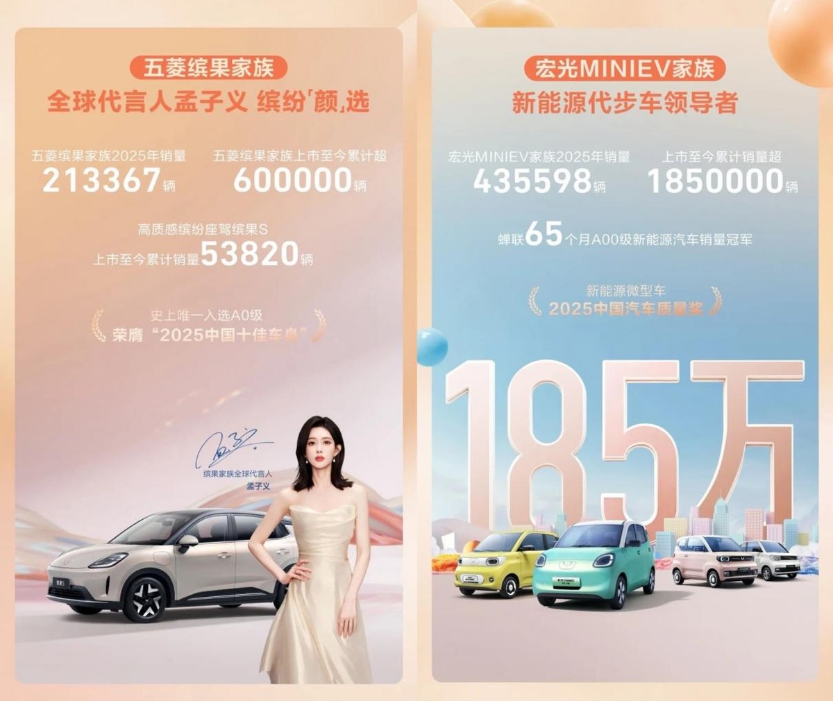 就从五菱表现最突出的两款“人民代步车”——缤果家族与宏光MINIEV家族来看,定位在A00级新能源代步车市场的宏光MINIEV从当初上市开始就一直保持在领先位置之上,像在10月它单月销量就超过了6万台,并对A00级新能源汽车市场实现了65个月连冠,并将整年累计销量锁定在了435598辆。从2020年上市至今,宏光MINIEV已经在五年多的时间里实现了185万辆的累计销量,可以说是实现了对于中国新能源代步车市场的统治。