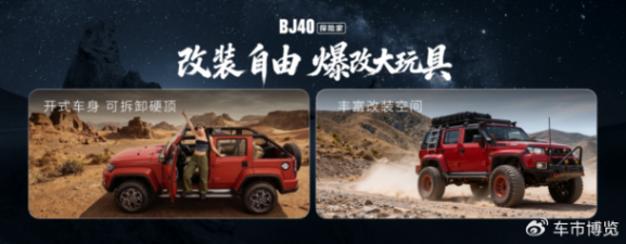BJ40探险家是一个“爆改大玩具”,采用同级唯一快拆硬顶设计和开式车身,硬派越野可变身敞篷越野车;支持深度创意,是一个容纳千种玩法、万般想象的潮流生活伙伴。