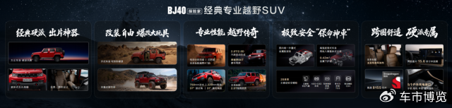 北京越野董事长王昊表示,BJ40作为中国越野的领路者,亲历过无数盛事荣耀,也成为中国汽车的独特文化符号,在全球用户的认可中走入了万千家庭。BJ40以探险家的名义,开启全新征程,在经典设计、自由改装、专业性能、极致安全和跨圈舒适五大维度再造新经典,为中国越野车市场再造经典专业越野SUV。