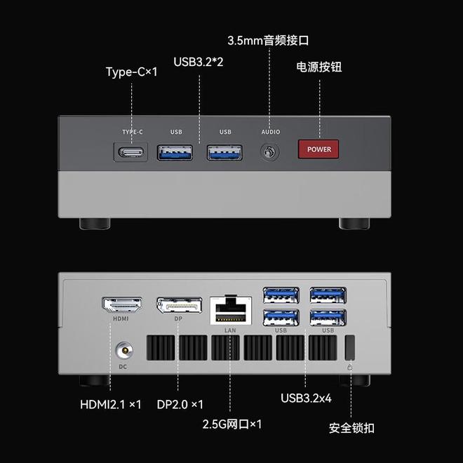 外部接口上,ACEMAGIC Retro X5 正面提供红色 POWER 电源按钮、1 个 USB-C 40Gbps、2 个 USB-A 10Gbps、1 个 3.5mm 音频插孔;反面提供 4 个 USB-A 5Gbps、1 个 2.5GbE RJ45、1 个 HDMI 2.1、1 个 DisplayPort 2.0、1 个电源接口、1 个 Kensington 肯辛通安全锁孔。