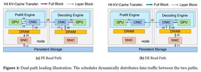 不同的数据块布局。DualPath 采用了两种不同的数据块布局:完整块和层级块,它们分别包含所有层的信息和单个层的信息。对于所有与存储系统的交互,均采用完整块。在 PE 读取的情况下,KV-Cache 加载到 PE HBM 以及传输到 DE 缓冲区的过程是以层级流式方式进行的,两者都使用层级块。同样地,对于 DE 读取路径,从 DE 缓冲区到 PE HBM 的传输也使用层级块。