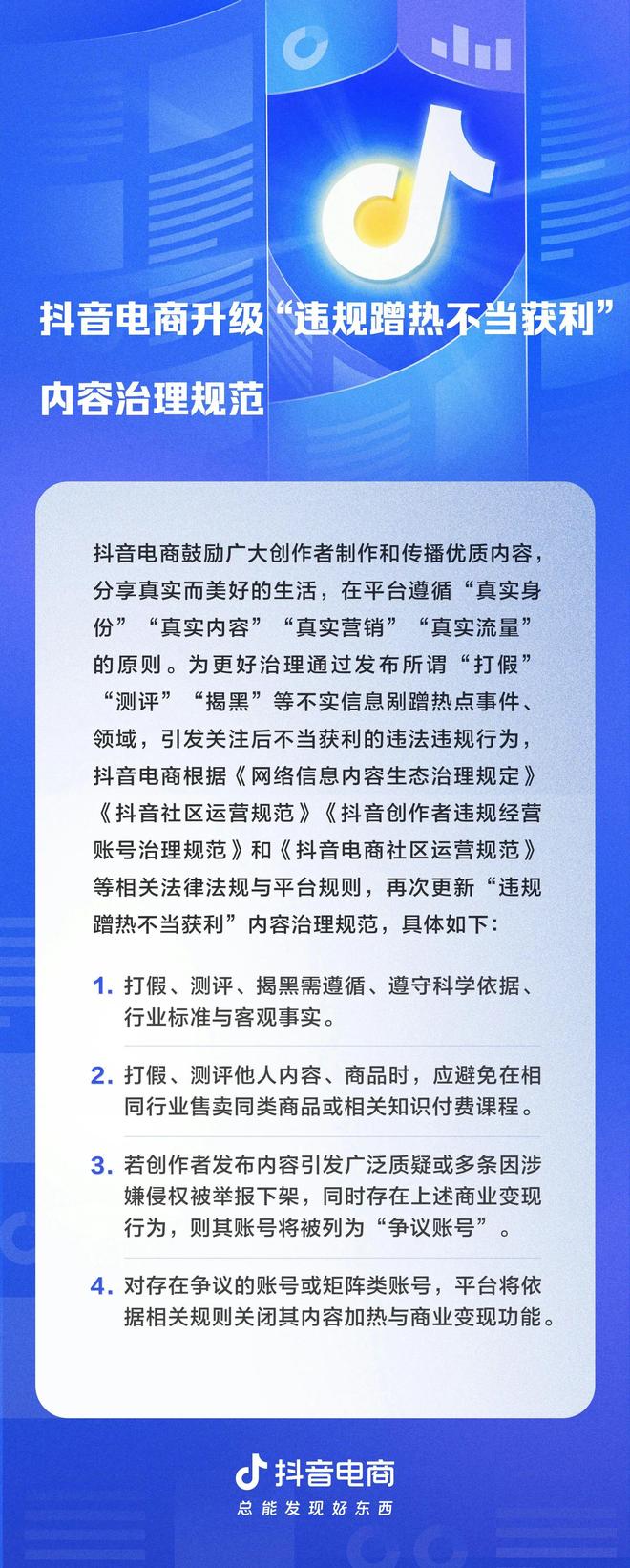 抖音电商强调,将严打缺乏科学依据、煽动对立、收割争议流量的不当获利行为,并呼吁用户通过举报通道共同维护平台生态。